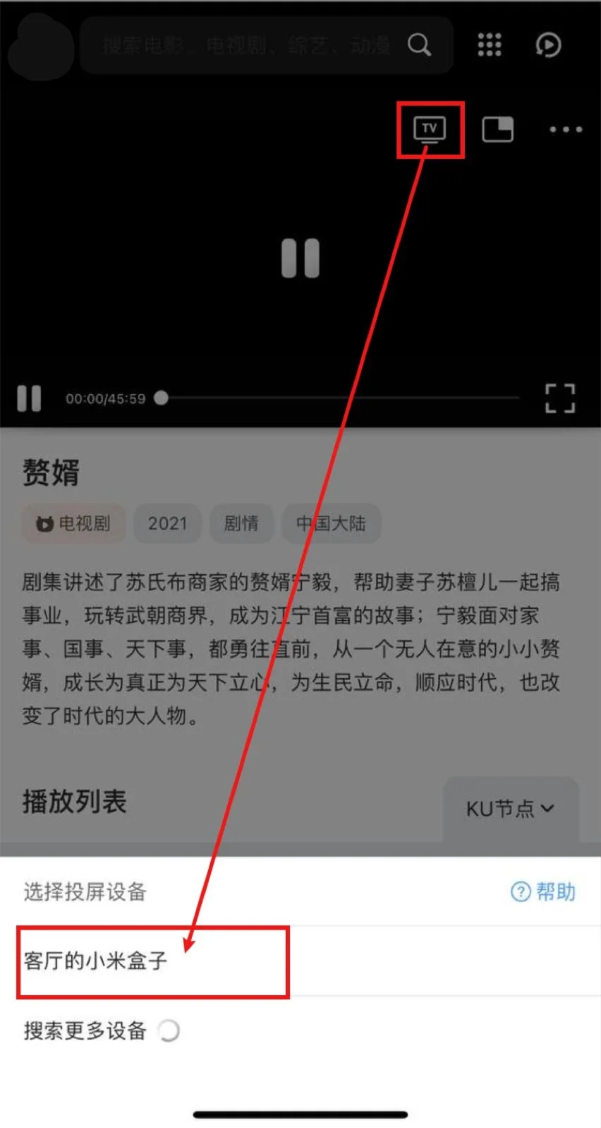打开QQ浏览器(会接管网页播放器)->打开聚星影院—最新高清免费电影在线观看下载->播放视频->选中投屏图标->等待搜寻出智能电视/电视盒子->选中,即可投屏。