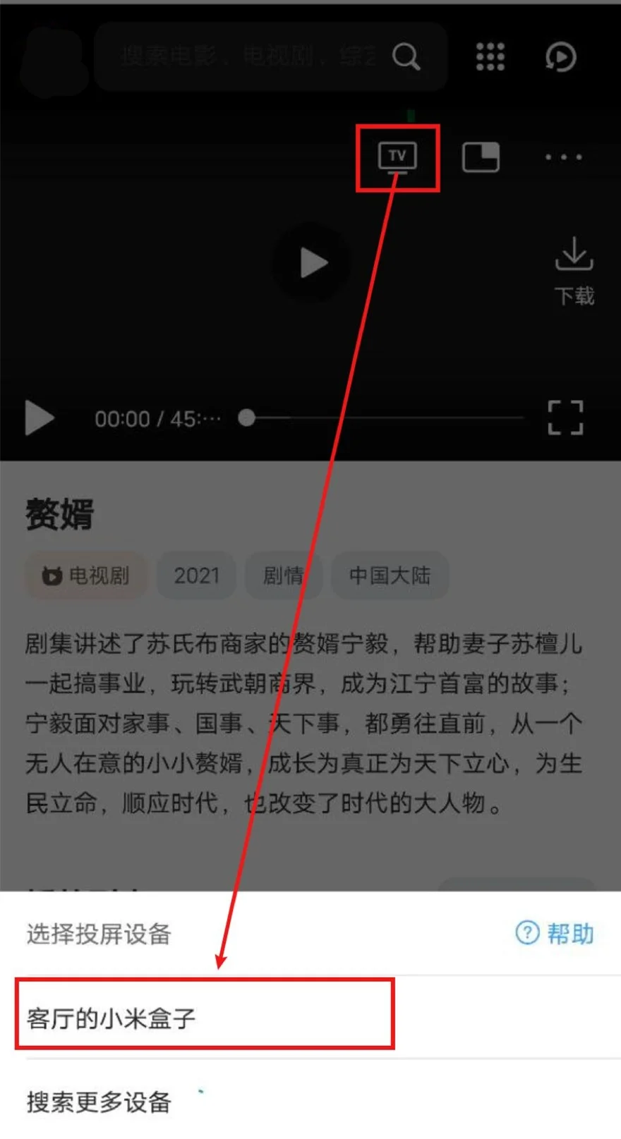 打开QQ浏览器(会接管网页播放器)->打开聚星影院—最新高清免费电影在线观看下载->播放视频->选中投屏图标->等待搜寻出智能电视/电视盒子->选中,即可投屏。